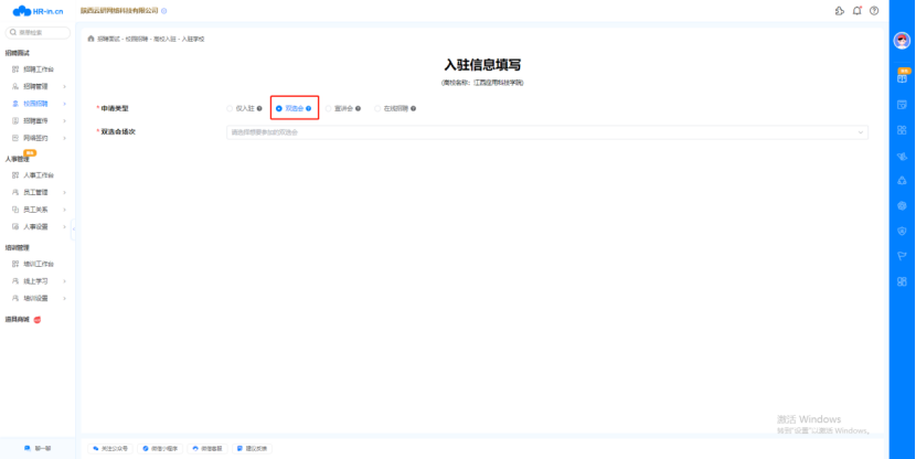 第二步:若貴單位尚未入駐我校就業(yè)平臺,需先提交入駐申請。在該場景下選擇“雙選會”申請類型,同時填寫入駐信息和雙選會申請信息。確認無誤后點擊“提交”,完成雙選會報名操作。