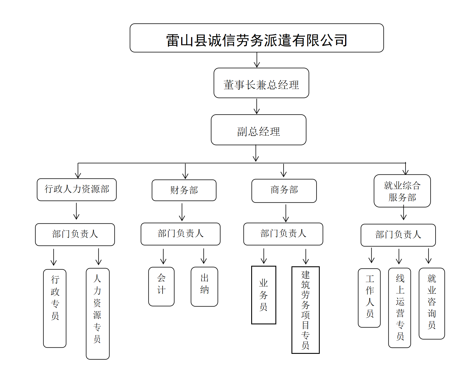 雷山縣誠信勞務(wù)派遣有限公司成立于2016年6月,系國有獨資公司。公司注冊資本為人民幣貳仟萬元(¥20000000.00),由雷山縣住房和城鄉(xiāng)建設(shè)局行使出資人職權(quán),貴州興雷投資開發(fā)(集團(tuán))有限責(zé)任公司代為管理。目前,公司在職人員17人,其中,正式職工9人,派遣制人員4人,見習(xí)生4人。公司下設(shè)行政人力資源部、財務(wù)部、商務(wù)部、就業(yè)綜合服務(wù)部四個部門。